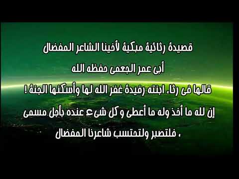 قصيدة رثائية مبكية لأخينا الشاعر المفضال أبي عمر الجعمي حفظه الله قالها في رثاء ابنته رفيدة غفر الله لها وأسكنها الجنة ! إن لله ما أخذ وله ما أعطى وكل شيء عنده بأجل مسمى ، فلتصبر ولتحتسب شاعرنا المفضال